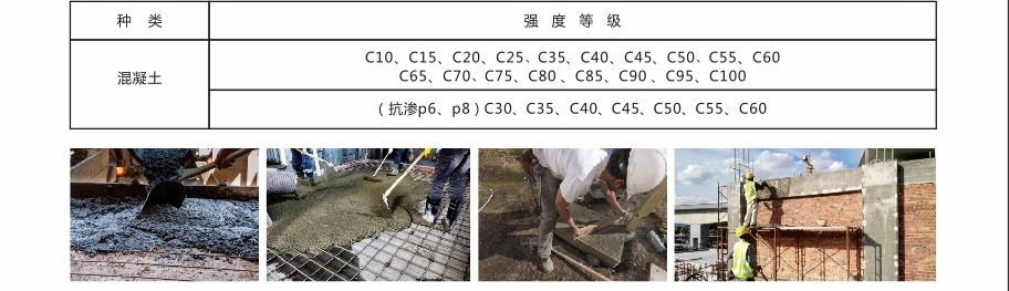 我司的目前主要研發(fā)和供應(yīng)的混凝土產(chǎn)品有:C10、C15、C20、C25、C30、C35、C40、C45、C50、C55、C60、C65、C70、  C75、C80,并成功研發(fā)出C85、C90、C95、C100超高強(qiáng)度混凝土。