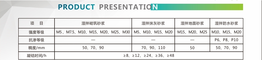 產(chǎn)品類型:濕拌砂漿有四個(gè)品種,即:濕拌砌筑砂漿、濕拌抹灰砂漿、濕拌地面砂漿和濕拌防水砂漿。